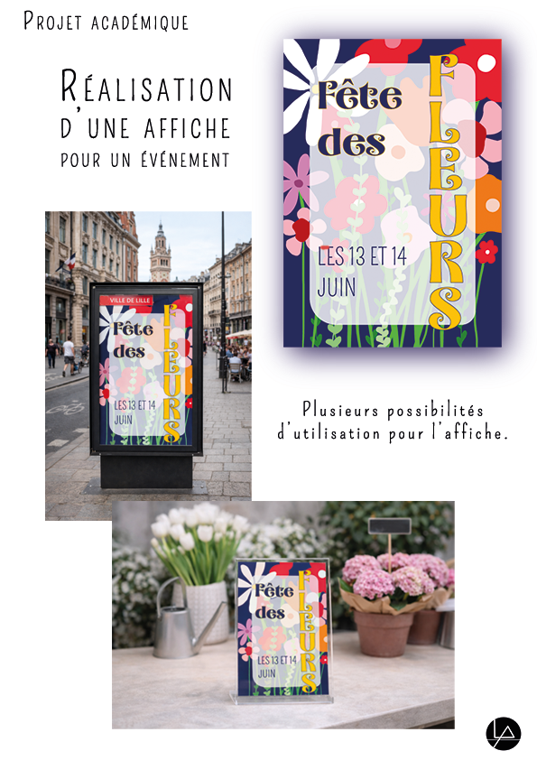 Dans le cadre d’un projet académique, j’ai travaillé sur la réalisation d’une affiche pour un événement (fictif) : la fête des fleurs se déroulant les 13 & 14 juin.